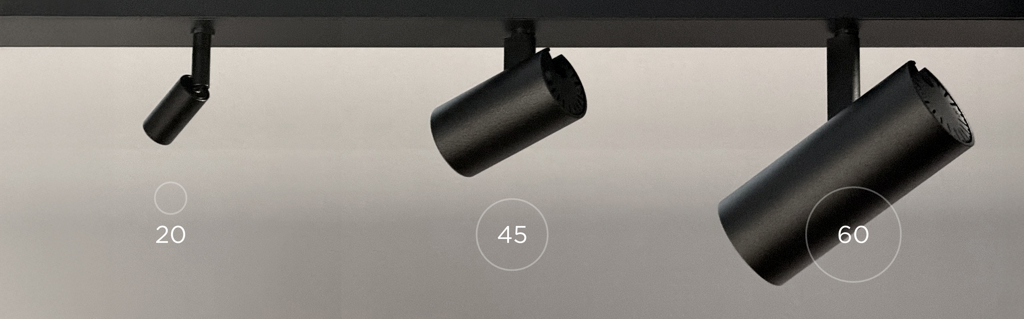 A NOOX 20 mm-es, 45 mm-es és 60 mm-es méretben kapható, sínre szerelhető, vagy meglévő világítóprofilra is ráépíthető. A ház fekete vagy fehér színben, a tölcsér pedig fekete vagy arany színben elérhető.